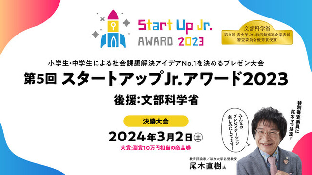 http://startupjr-award.jp(プレエントリー受付もこちら)*その他2023年度大会に関する詳細については、公式サイトをご覧ください。新たな情報についても随時更新してまいります。