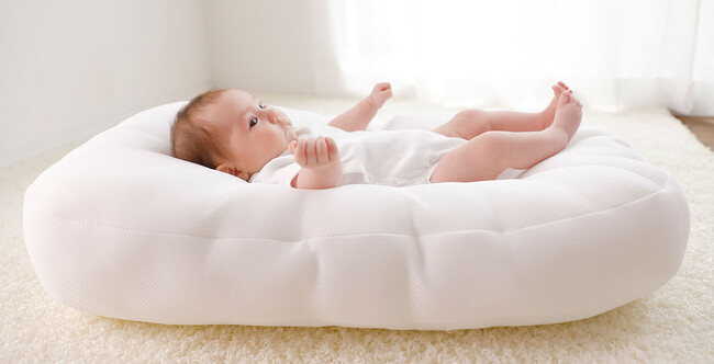 月齢が小さい赤ちゃんは、体重も軽く体つきも小さいため、Cカーブベビーベッドに寝かせたとき傾斜で身体がすべって凹みにはまってしまうことも。パッドの足元の生地をくるくると丸めて、赤ちゃんのお尻の下にストッパーを作ることにより、体の小さな時期でも、Cカーブベビーベッドの窪みに体が滑り落ちにくくなり、フィット感がUP!Cカーブベビーベッドをより使いやすく快適にお使いいただけます。
