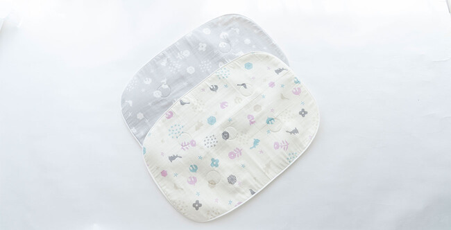 生地の両面は、通気性・吸水性に優れた綿100%。表面のガーゼ生地(モスリンガーゼ使用)は毛羽立ちが少なくサラッとした感触、裏面のパイル生地は柔らかな質感と吸水性を持ち、赤ちゃんの睡眠をサポートします。また、汚れてもサッと丸洗いできるので、清潔にお使いいただけます。