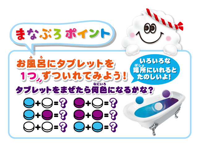 お風呂にタブレットを1つずつ入れてみたら、何色に変化するかな?いろんな色の混ざりを体験しよう♪