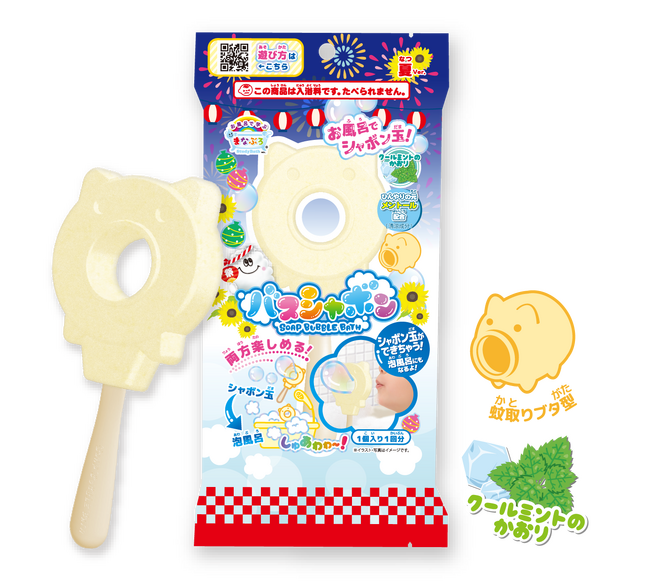 シャボン玉を楽しんだ後は、泡風呂としても楽しめます。フィズ部分の「蚊取りブタ」の形が夏らしさを演出。