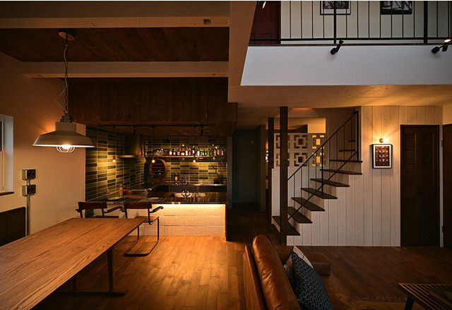 さらにデザインのポイントとして、アイアンの手摺や花ブロック、キッチンの床と壁にはタイルを貼り、リビングにはビンテージの照明を使用。ダイニングスペースには革張りのベンチがセッティングされ、自然素材とビンテージ素材が同居するミッドセンチュリーな住空間へとアップデートされています。