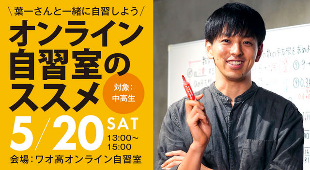 激動の時代を生き抜く力を、実学と教養によって育む、学校法人ワオ未来学園ワオ高等学校(本校所在地岡山県岡山市 校長山本潮)(以下ワオ高校)は、2021年4月開校。好きな時間に好きな場所で学ぶことができる完全オンラインの学校です。哲学・科学・経済の教養探究を通じて、実社会で生きる力を養っています。 ワオ高校では、「自習のやり方が分からない」「一人で自習していても集中できない」「モチベーションの維持ができない」など、中高生が抱える「自習」の悩みを解決するために、ワオ高生だけでなく、中高生なら誰でも利用できる「オンライン自習室」を開設することにいたしました。 この「オンライン自習室」の開設にあたり、中高生に絶大な人気を誇る教育系YouTuber「とある男が授業をしてみた(登録者数188万人) 」の葉一さんをお招きし、自宅学習のコツをお話いただきます。イベント時は、参加者みんなで葉一さんと一緒に自習にチャレンジ。図書館やカフェで勉強するかのように、葉一さんや勉強仲間の存在を感じながら、学習します。この自習のコツをつかむことができれば、着実に力が身につきます。力がつくと、自信につながり、学ぶこと自体が「楽しさ」に変わります。教育から学育へ、ワオ高校は、未来型の学びを実践し、中高生が自ら学び育つ力を身につけるサポートをしていきます。●葉一(はいち)氏 プロフィール:東京学芸大学を卒業後、営業職、塾講師を経て独立。2012年にYouTubeチャンネル「とある男が授業をしてみた」を開設。小学校3年生から高校3年生対象の授業動画や、学生の悩み相談にこたえる動画を投稿している。チャンネル登録者188万人、再生回数は6億回を超える。著書に『塾へ行かなくても成績が超アップ! 自宅学習の強化書』(フォレスト出版)などがある。ワオ高校のオンライン自習室・開設記念イベント「オンライン自習室のススメ」●葉一さんが、自習のコツをレクチャー!●葉一さんと一緒に、オンライン自習室で勉強してみよう! ●イベント後も、集中力&楽しさをアップする「オンライン自習室」をフリー利用OK!こちらのURL/QRからお申し込みください。