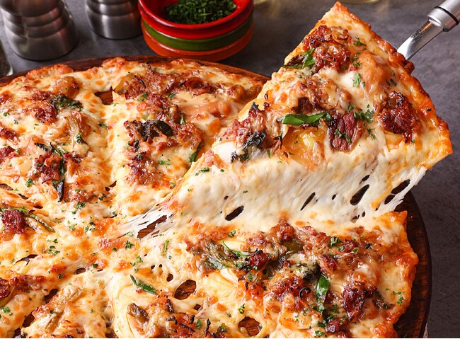 他では味わえない、学生たちのすき焼き愛が詰まったピザは、「まち部。」が2019年に地元野菜「大和まな」「一光ねぎ」を使用して開発、商品化したレトルトすき焼きをベースに、肉感、甘辛風味を加えてアレンジしたすき焼き具材、さらに一光ねぎや特製すき焼きタレマヨソース、ピザーラのナチュラルチーズをのせて焼き上げた、すき焼きを感じる今までにないピザです。