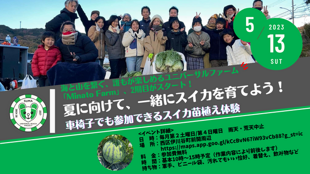 NPO法人須磨ユニバーサルビーチプロジェクトは、全ての家族が楽しめるスイカ苗植え体験イベントを、5月13日(土)10時より「Minato Farm」で開催します。親子で参加でき、障がいの有無に関係なく楽しめるこのイベントは、ユニバーサルファーム「Minato Farm」の2期目を盛り上げます。