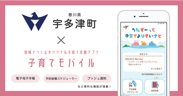 今後は、宇多津町からのお知らせを月齢・年齢にあわせてタイムリーに受信できる「メール配信・プッシュ機能」、育児相談やセミナー、各種イベントなどの予約ができる「オンライン予約サービス」、成長グラフや乳幼児健診の記録など母子手帳の内容をマイページに記録できる「電子母子手帳機能」、予防接種漏れや接種間隔ミスを防ぐことができる「予防接種AIスケジューラー」など、ICTを活用した子育て世代への継続的なサポートを実現します。