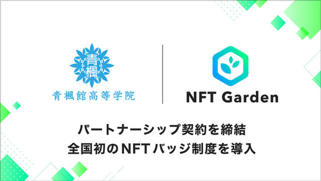 企業向けNFT生成プラットフォーム「NFT Garden」の開発・運営を行うConnectiv株式会社(代表取締役:石井 裕希、以下「Connectiv」)と、明石市に開校した総合型選抜の進学支援等に強みを持つ青楓館高等学院(校舎:兵庫県明石市、代表:岡内 大晟、以下「青楓館」)は、web3/NFT領域における事業協力に向けたパートナーシップ契約を締結いたしました。またConnectivは、青楓館 Web3部顧問の上田 敏孝氏(株式会社DAO 代表取締役CEO)と連携をし、全国で初めて(※1)生徒の成長を促進する勲章システムとして「NFTバッジ制度」を導入します。