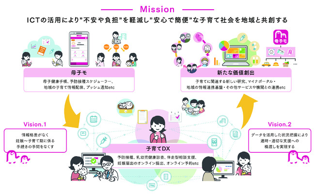 当社は、2030年までに、妊娠から子育て期の手続きについて、必要な人に情報を届け、保護者、自治体、医療機関の手間を無くすことをビジョンとして掲げています。子育て関連事業のデジタル化を支援するサービス『母子モ 子育てDX』では、厚生労働省の乳幼児の定期予防接種予診票のデジタル化に向けた地域実証※1を行い社会実装するなど、さまざまな子育て関連事業のDXを推進することで、保護者の“不安や負担”を軽減し、“安心で簡便”な子育て社会を地域と共創することを目指します。