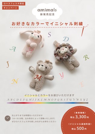 amimals発売を記念して、今回のロハスフェスタでは5月3日(水)と4日(木)限定でお好きなイニシャルをその場で刺繍してもらえるサービスを実施。本体価格プラス500円でイニシャルのカラーを選んで本体に刺繍します。(※ 雨天の場合中止)