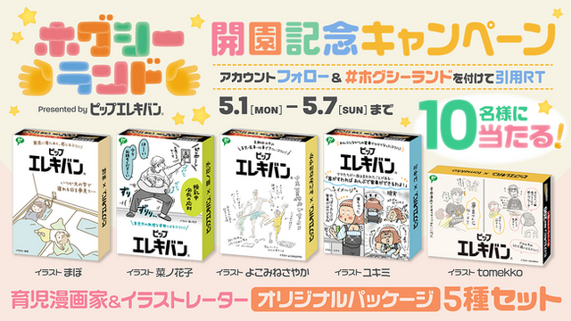 ピップ株式会社(本社:大阪市中央区、代表 取締役社長:松浦由治)が製造販売する、磁気の力で血行を改善しコリをほぐす磁気治療器「ピップエレキバン」シリーズは、育児疲れに悩むママやパパを応援し、サポートすることを目的とした整体*つきキッズパーク「ホグシ―ランド Presented by ピップエレキバン」の開園を記念して、 2023年5月1日(月)~5月7日(日)の期間中、5名の人気育児漫画家&イラストレーターの方にデザインいただいた、限定スリーブ入りのピップエレキバンがセットで当たるプレゼントキャンペーンを実施します。