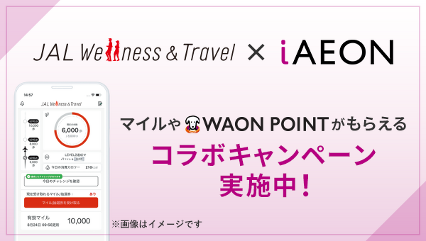 この度、両社の提携の一環として、健康・旅に強みを持つ「JWT」と、新しいライフスタイルの価値提供を目指すイオンのトータルアプリ「iAEON」は、「JWT」の会員さまがイオンのグループ店舗に訪れることでJALのマイルがたまる「チェックインチャレンジ」のほか、「iAEON」の会員登録を初めて行うとWAON POINTがもらえるなど、アプリ間での相互送客のキャンペーンを実施します。