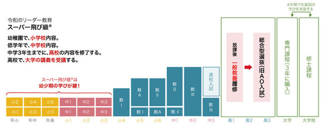例えば、幼児期ならば、確かな母語の確立や思考力の育成のために言葉(国語)や数(算数)の導入を図ります。そして、低学年では、幼児期に育んだ主体的な学びの姿勢や学びに対する得手意識やプライドを完成させます。それに、早期に始めれば、誰でもスーパー飛び級(R)です。