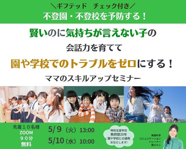 はじめまして 発達科学コミュニケーショントレーナー南ひろこです。ギフテッドキッズが伝わる会話力を身につける専門家として活動しています。この度は、『\ギフテッドチェック付き/不登園・不登校を予防する!賢いのに気持ちが言えない子の会話力を育てて学校トラブルをゼロにする!ママのスキルアップセミナー』の募集をスタートしました。