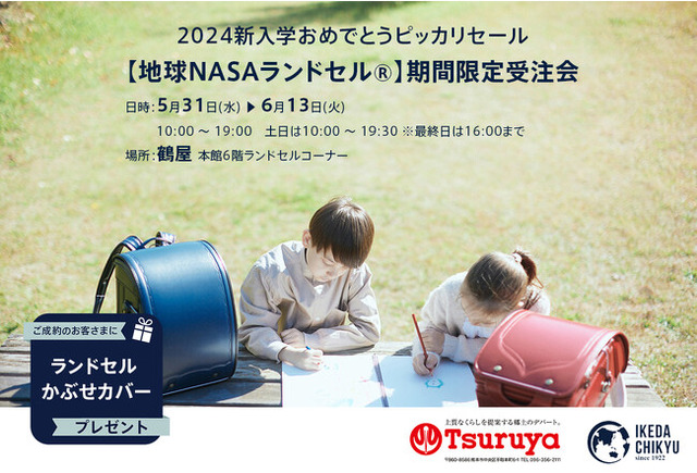 オリジナルランドセル「地球NASAランドセル(R)」の企画・販売を行う池田地球株式会社(本店:東京都港区:代表取締役 村尾光一)は、5月31日(水)~6月13日(火)の期間、鶴屋本館6階 ランドセルコーナーにて「2024新入学おめでとうピッカリセール【地球NASAランドセル】期間限定受注会」を開催いたします。