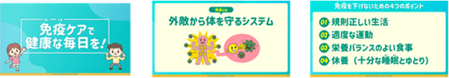 本教材は、当社が35年以上にわたる「免疫」の研究成果と、「免疫ケア」の啓発活動で培った知見を生かし、教育現場に詳しいARROWSと共同で開発したもので、ゲームや座学を通じて、45分間で楽しく「免疫」について学ぶことができ、「免疫ケア」の重要性を啓発できます。