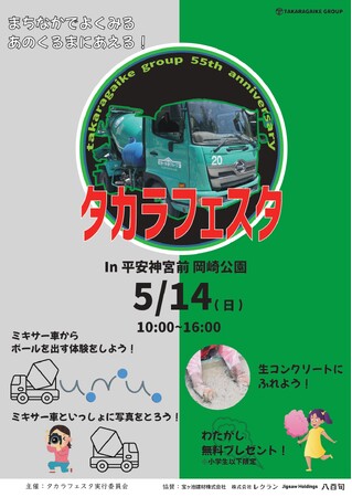 宝ヶ池グループの宝ヶ池建材株式会社(京都市左京区、代表取締役 野川家豊)は、地元のみなさまのおかげで、設立55周年を迎えました。日頃の感謝を込めまして、このたび「平安神宮前 岡崎公園」にて、周年イベント「タカラフェスタ」を5月14日(日)に実施させて頂きます。
