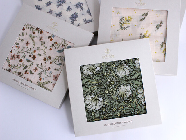 赤ちゃんを花束のように優しく包み込むおくるみ『花束スワドル』シリーズ第1弾は、Instagramの人気投票で選ばれた5種類のデザインを商品化しました。インテリアデザインとしても人気のウィリアム・モリス、ジェンダーレスな小花柄などのラインナップを展開します。スワドルの柄が見える窓付きパッケージは、高級感のあるゴールドの箔押しロゴ付きボックスで、出産祝いにそのまま贈ることができます。