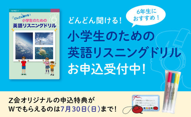 株式会社増進会ホールディングス(Z会グループ)のグループ会社である株式会社Z会は、小学校高学年の学習段階に適した英語リスニングドリル、『どんどん聞ける!小学生のための英語リスニングドリル』の2023年度申込受付を5月10日(水)より開始しました。また、期間限定でZ会オリジナル申込特典のプレゼントキャンペーンを実施中です。ぜひこの機会にお申し込みください。