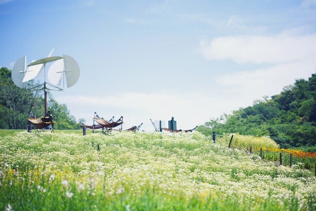 日中は、真っ青な空の下で太陽の光を浴びた花々たちを。夕暮れ時には、黄金色に染まるお花畑に囲まれながら美しい写真が撮れるスポットでもあります。