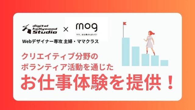 IT関連及びデジタルコンテンツの人材育成スクール、デジタルハリウッド(運営会社:デジタルハリウッド株式会社 本社/本校:東京都千代田区 学長:杉山知之)が運営をする、新しい学びのスタイルを通して多様なライフスタイルを支援し全国へ展開している、Webと動画について学べるラーニングスタジオ『デジタルハリウッドSTUDIO』のSTUDIO渋谷・自由が丘を中心とした校舎において、ワーキングママのキャリア支援事業を展開する株式会社mog (本社:東京都渋谷区、代表取締役社長:稲田 明恵、以下mog)と共に、「専科Webデザイナー専攻主婦・ママクラス」の受講生・卒業生のための就業サポートの一環として、mogが運営する「ママボラン」のサービス提供を開始します。