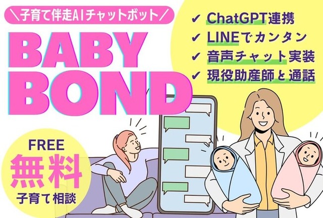 「いつも隣にいて気軽に相談できる子育て伴走パートナー」としてBABY BONDサービスを開発。<機能1>24時間いつでも気兼ねなく相談できるAI対話機能(ChatGPT活用)に加え、<機能2>現役助産師とLINE通話するサービスを提供します。