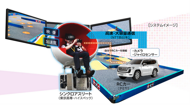 株式会社タミヤ(代表取締役会長 兼 代表取締役社長:田宮 俊作、以下、タミヤ)、国立東京工業高等専門学校(校長:谷合 俊一、以下東京高専)、株式会社ハイスペック(代表取締役:諸星 真孝、以下ハイスペック)、西日本電信電話株式会社 静岡支店(支店長:番匠 俊行、以下、NTT西日本)は、ラジオコントロールカー(以下RCカー)に搭載した360度カメラとジャイロセンサーの情報を大容量の通信により「シンクロアスリート(※1)」に送信することで、RCカーの操作にあわせ「臨場感あふれる映像・動き」を疑似体験できる『タミヤRCカー』シンクロドライビングを、RCカーフェスティバル in ホビーのまち静岡にて開催します。