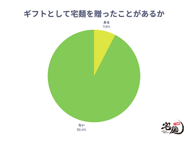 ギフトとして宅麺を贈ったことがあるか聞いたところ、「ある」と回答したユーザーは7.6%にとどまり、宅麺.comのギフト利用は十分に浸透していないことが分かります。