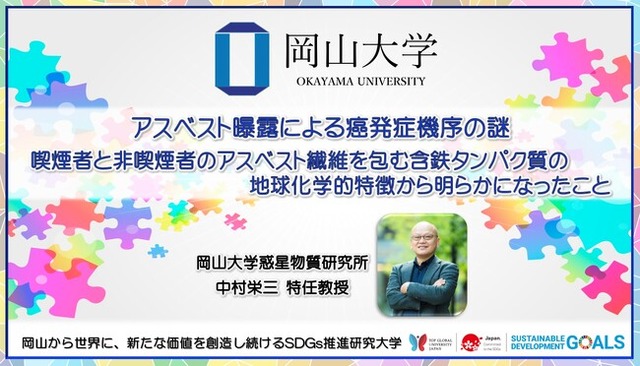 国立大学法人岡山大学(本部:岡山市北区、学長:那須保友)の岡山大学惑星物質研究所(鳥取県東伯郡三朝町)の中村栄三特任教授らの研究グループは、悪性胸膜中皮腫患者(喫煙者と非喫煙者)の肺全摘手術後の肺組織からアスベスト小体を分離し、地球化学的手法を応用し、これらを比較観察しました。