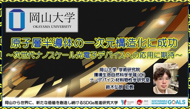 国立大学法人岡山大学(本部:岡山市北区、学長:那須保友)の岸淵美咲(研究当時 岡山大学大学院自然科学研究科博士前期課程2年、現ローム株式会社)と同大学学術研究院環境生命自然科学学域の鈴木弘朗助教、鶴田健二教授、林靖彦教授、三澤賢明(研究当時 岡山大学学術研究院自然科学学域 助教、現福岡工業大学 助教)の研究グループは東京都立大学大学院理学研究科物理学専攻の宮田耕充准教授、産業技術総合研究所の劉崢上級主任研究員らと共同で、酸化タングステンナノワイヤの成長を介した新しい化学気相成長法により、原子レベルに薄い半導体材料(遷移金属ダイカルコゲナイド、TMDC:Transition Metal Dichalcogenide)の“ナノリボン”と呼ばれる一次元構造の合成に成功しました。