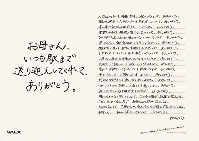 このポスターが、普段は言えないお母さんへの想いを伝えるきっかけになれば、そして日頃から頑張るお母さんたちの心の支えになればと思っております。