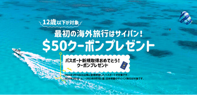 マリアナ政府観光局は、「マリアナケーション超得キャンペーン」の新たな特典として、12歳以下を対象にパスポート新規取得費用相当分50ドルクーポンをプレゼントする「パスポート取得サポート特典~マイファーストバケーションはマリアナ!」を、本日2023年5月15日(月)より受付開始します*。