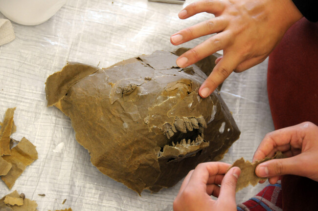 ダンボールを潰して!揉んで!水につける!作家独自の製法を学びながら、好きな生き物に再生させます。