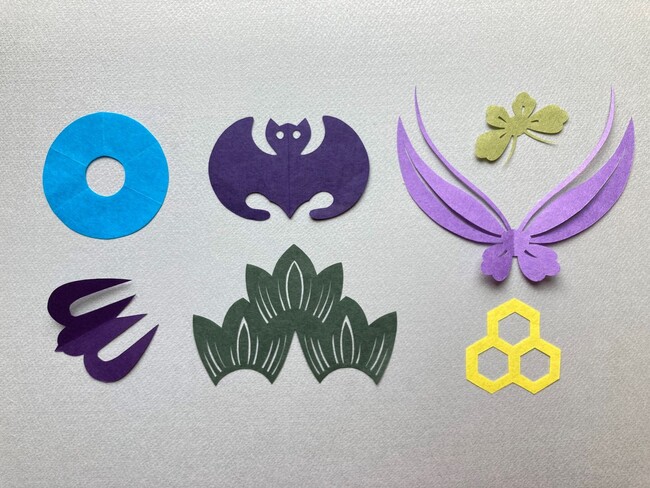 の「家紋」。造形作家の下中菜穂氏と、蝶やコウモリ