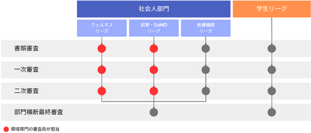 審査は「ウェルネスリーグ」、「創薬・SaMDリーグ」、「医療機関リーグ」の3リーグに分けて行います。リーグごとに書類審査、リーグ予選、リーグ決勝戦の流れで部門優勝を決定し、その後、部門横断最終審査としてリーグ横断での総合優勝を決定いたします。
