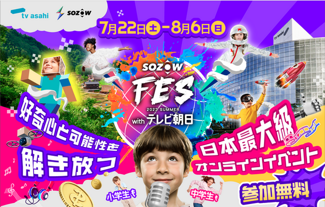 「好奇心と可能性を解き放ち、未来をSOZOW(創造)する学びの生態系をつくる」をビジョンに掲げるSOZOW株式会社(所在地:東京都品川区、代表取締役:小助川 将)は、2023年7月22日(土)~8月6日(日)のうちの7日間、「学び」と「エンターテインメント」を融合した、小中学生向けのエデュテインメントイベント「SOZOW FES 2023 Summer with テレビ朝日」を株式会社テレビ朝日と共同開催します。