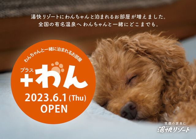 「笑顔の源泉に」を掲げ、温泉リゾート体験を提供する湯快リゾート株式会社(住所:京都府京都市 代表取締役社長:西谷浩司 以下、湯快リゾート)は、2023年に20周年を迎えるにあたり、新たな取り組みの一つとしてわんちゃんと一緒にご宿泊いただける専用客室「プラスわん」を増設し、2023年6月1日(木)にオープンいたします。