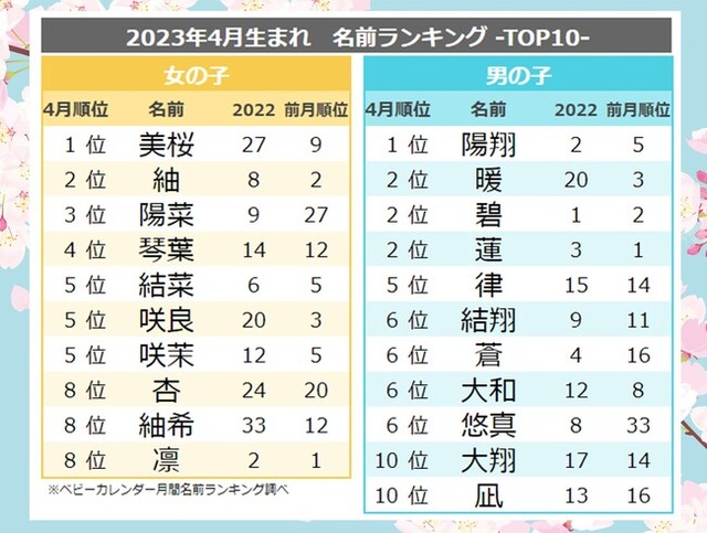 4月生まれの女の子の名前で首位に躍り出たのは、「美桜(主なよみ:みお)」。2月は90位でしたが、3月に9位へ大きくランクアップし、4月は1位に! さらに、5位「咲良(主なよみ:さくら)」、11位「桜(主なよみ:さくら)」、13位「さくら」、20位「未桜(主なよみ:みお)」、28位「凛桜(主なよみ:りお)」、38位「凪桜(主なよみ:なぎさ)」、46位「桜音(主なよみ:おと)」、46位「莉桜(主なよみ:りお)」と、TOP50位以内に「サクラネーム」が9つもランクインしています。