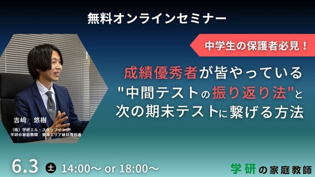 株式会社学研ホールディングス(東京・品川/代表取締役社長:宮原博昭)のグループ会社、株式会社学研エル・スタッフィング(東京・高田馬場/代表取締役社長:伊藤弘雅)が運営する学研の家庭教師が「成績優秀者が皆やっている、中間テストの振り返り法と次の期末テストに繋げるセミナー」を2023年6月3日(土)に開催いたします。