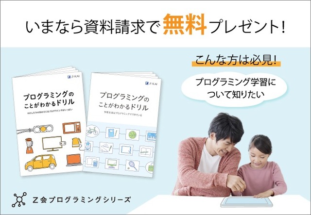 株式会社増進会ホールディングス(Z会グループ)のグループ会社である株式会社Z会は、年長~中学生向けの自宅で学べる「Z会プログラミングシリーズ」において、お子さま向けのプログラミングドリルとプログラミングの学び方がわかる情報冊子を無料プレゼントするキャンペーンを、2023年5月1日(月)~7月6日(木)まで実施中です。お子さまのプログラミング学習について不明点やお悩みをお持ちの保護者の方におすすめです。ぜひこの機会にご請求ください。