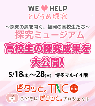 TNCでは開局65周年事業「こどもにピタッと。プロジェクト」のひとつとして、高校生の探究学習をサポートするために今年度より「とびうめ探究」をスタートすることとしております。これを機会に「とびうめ探究」についても関心を持っていただければ幸いです。