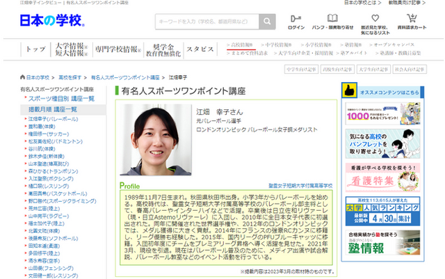 全国の大学・短大・専門学校などの学校情報を提供する、株式会社JSコーポレーション(本社:大阪市北区 代表取締役社長:米田英一)は、スポーツワンポイント講座「バレーボール/江畑幸子選手」(https://school.js88.com/scl_h/onepoint-advice/sport?item=5&athlete=209)」を公開しました。