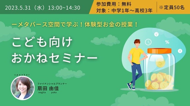 それに伴い、今回はメタバース空間への参加や講義の雰囲気を広く味わっていただくため、ファイナンシャルプランナーの 扇田 由佳(オオギタ ユカ) さんを講師にお招きして、「こども向けおかねセミナー」を開催いたします。