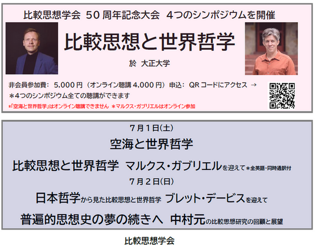 比較思想学会は、7月1日(土)、2日(日)の2日間、大正大学巣鴨キャンパスにて、「創立50周年記念大会」を開催し、統一テーマ「比較思想と世界哲学」に基づいた4つのシンポジウムを行います。