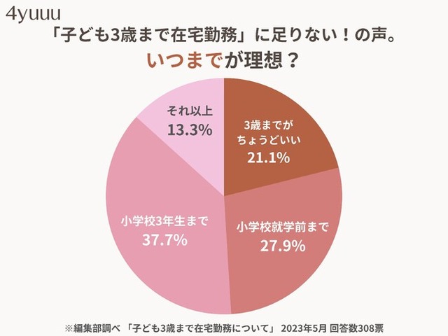 とはいえ、(保育園などに子どもを預けられる状態が確保されている前提で)在宅勤務が可能になれば、通勤時間が削減される分時間の調整がしやすくなり、嬉しいと感じるママも多いはず。ただ、「3歳までが適切なのか?」という疑問が編集部内で上がり、アンケートを実施する運びとなりました。