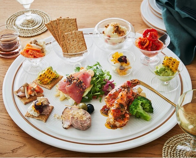 ・内容:漬けマグロとモッツァレラチーズのサラダ(焦がしにんにく醤油ドレッシング)/人参の粒マスタード和え/きのこの白ワインビネガーマリネ/ラム酒香るクリームチーズ ドライフルーツがけ/黒胡椒ハム/パテ・ド・カンパーニュ/オリーブ/ベーコンチーズパン粉のせポテトサラダ/ソフトシェルシュリンプのハーブソース/亜麻仁オイル入りワカモレディップ グリルコーン添え/塩麹のトマトディップ セミドライトマト添え/クラッカー