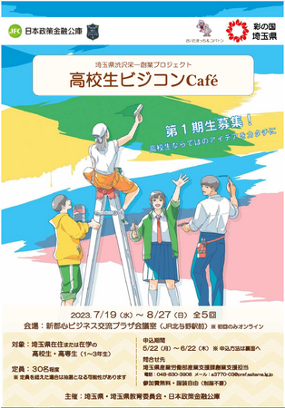 埼玉県と埼玉県教育委員会は、日本政策金融公庫との共催により、本年度新たに「高校生ビジコンCafe」を開催します。「高校生ビジコン Cafe」は、ビジネスプランの作成を通じて、これからの社会で活躍するために求められる「起業家精神(チャレンジ精神、創造性、探究心など)」や「起業家的資質・能力(情報収集・分析力、判断力、実行力、リーダーシップ、コミュニケーション力など)」を養うプログラムです。