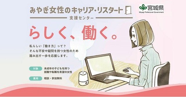 宮城県が設置している「みやぎ若年者就職支援センター(通称: みやぎジョブカフェ)」内に女性のための再就職等支援施設「みやぎ女性のキャリア・リスタート支援センター」を開設し、キャリアコンサルティング業務など各種就職支援業務や仕事と子育ての両立に向けた「働き方改革」に関する啓発事業などを実施します。