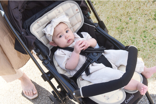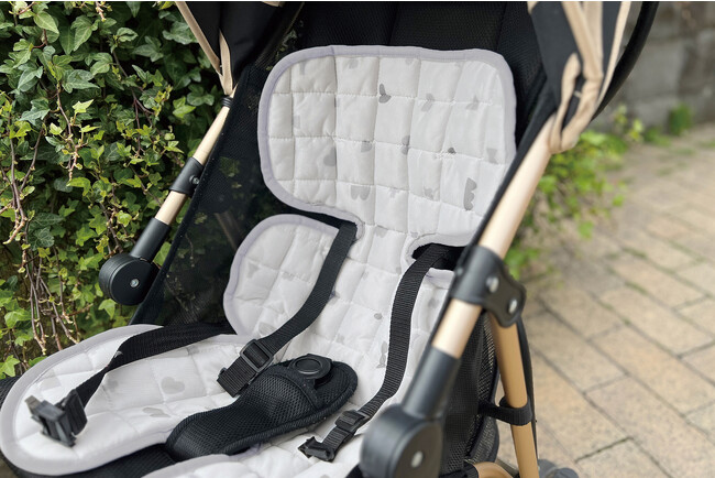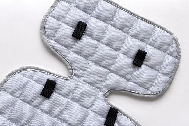 裏面には通気性に優れたメッシュ生地を採用。ベビーカーとのシートの間にすき間を作り、こもりがちな熱を逃がし、ムレを防いでくれます。また、3層構造の間の中綿が、ふわっと心地よいクッションに。涼しいだけでなく、快適な乗り心地を実現します。