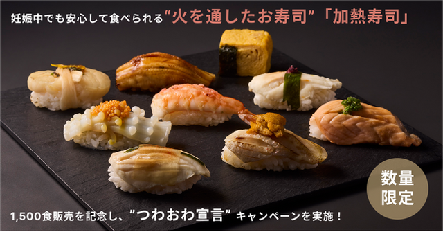 ”妊娠中でも安心して食べられる火を通したお寿司”「加熱寿司」(かねつずし)は2022年11月22日に販売開始し、3分で初回販売分が売り切れました。その後、生産体制を強化し、6ヶ月間で1,500食販売を達成しました。加熱寿司より感謝の気持ちを込めて、妊娠中の皆様へ数量限定で加熱寿司をプレゼントする「つわおわ宣言キャンペーン*」を実施します。