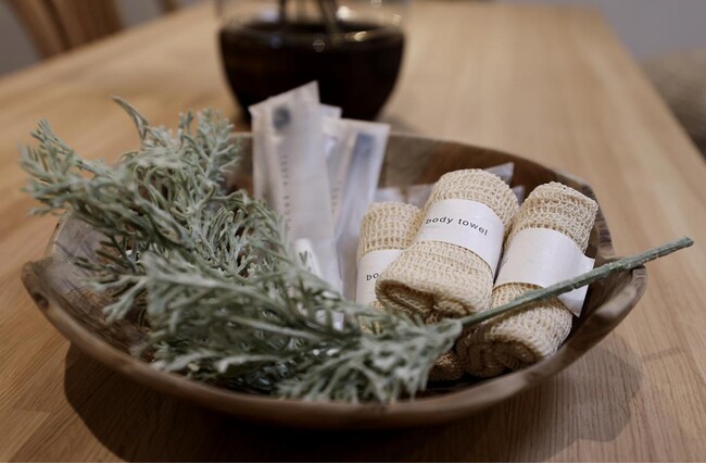 当施設で使用しているアメニティは、バイオマス製品シントワールド「エコアメニティシリーズ」を使用しています。このシリーズは、籾殻を配合した原料や再生プラスチックを使用しており、包材も紙製のため、環境に配慮した製品です。ヘアブラシ、歯ブラシについては、バイオマスマーク40(※2)を取得しています。また、ボディタオルはオーガニックコットンで作られています。